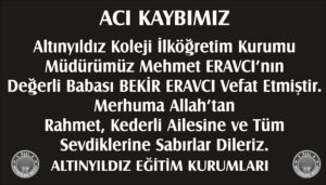 Altınyıldız Koleji İlköğretim Kurumu Müdürümüz Mehmet ERAVCI’nın Değerli Babası Bekir ERAVCI Vefat Etmiştir.