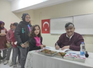 Yazar Aytekin söyleşi sonrası öğrencilerin yazarlık ve kitaplarla ilgili sorularını cevapladı. Daha sonra ilk ve ortaokul öğrencilerine yönelik kitaplarını imzaladı.