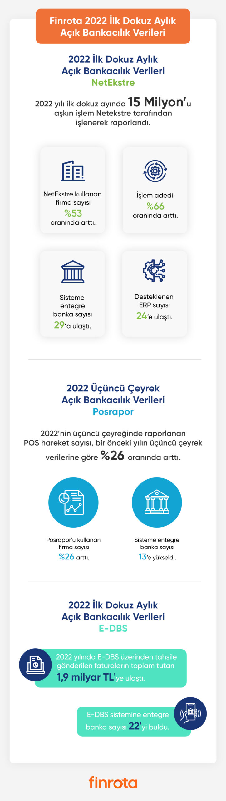 NetEkstre’nin verilerini değerlendiren Finrota Genel Müdürü İlknur Uzunoğlu, dijital bankacılığı ve şirketlerin finansal yönetim süreçlerini yeniden tanımlayan Açık Bankacılık pazarının büyüdüğünü ifade ederek şunları söyledi: “Açık Bankacılık teknolojilerinin kullanıcılara sunduğu avantajların ve ihtiyaçlara yönelik getirdiği çözümlerin anlaşılmasıyla birlikte bu hizmeti alan şirketlerin sayısı artıyor. Biz de NetEkstre platformumuzla, her geçen gün daha çok firmanın dijital dönüşümüne katkı sağlıyoruz. Firmaların, banka hesap bilgileri, hesap hareketleri ve raporlamalar konusunda oluşan ihtiyaçlarına NetEkstre’nin getirdiği yeniliklerle çözümler sunuyoruz. Kullanıcılarımız, NetEkstre sayesinde banka hesaplarındaki tüm hesap hareketlerini online olarak ERP/muhasebe sistemlerine aktarabiliyor ve bu sayede banka hesap hareketlerini tek panelden anlık olarak takip edebiliyor.”