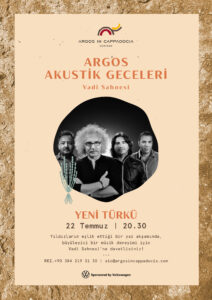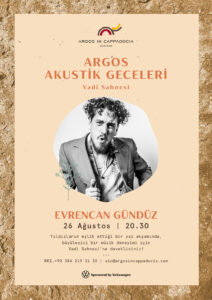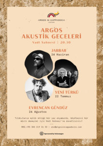 Bulunduğu bölgenin benzersiz dokusunda unutulmaz bir konaklama deneyimi sunan Argos in Cappadocia, ev sahipliği yaptığı kültür sanat programlarıyla ziyaretçilerine unutulmaz anlar yaşatıyor. Otel içerisinde yer alan Vadi Sahnesi‘nde, birbirinden özel sanatçıları ağırlayacak “Argos Akustik Geceleri” açık hava yaz konser serilerinde Jabbar, Yeni Türkü ve Evrencan Gündüz Volkswagen sponsorluğundasanatseverlerle buluşuyor.