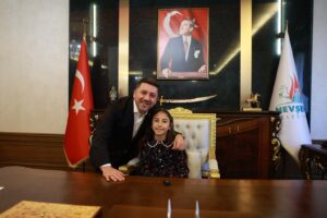 23 Nisan Çocuk Bayramı dolayısıyla Başkanlık Makam koltuğuna oturan Mihriban Emin Günel Ortaokulu öğrencisi Elif Özer, Mustafa Çalışkan İlkokulu öğrencisi Âmine Rüveyda Işık, 100. Yıl İlkokulu öğrencisi Resul Doruk Akdemir, Ersular İlkokulu öğrencisi Elifsu Temel, Mustafa Can ve diğer öğrenciler, Çocuk Bayramı dolayısıyla başkanlık koltuğuna oturarak istek ve taleplerini Nevşehir Belediye Başkanı Rasim Arı’ya iletti.