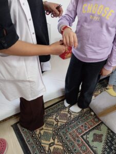 10-12 yaş arası 6 çocuğun katıldığı etkinlikte misafir çocuklara Halı Dokuma Eğitmeni Fatma Turgut ve kursiyerler tarafından kilim dokuma bileklik yapımı gösterilerek hediyeler takdim edildi.