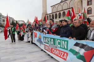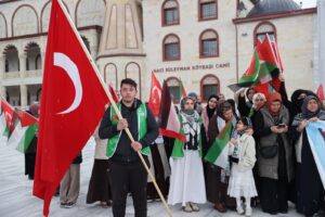 Daha sonra Külliye önünde toplanan vatandaşlar tekbir getirdi ve katil İsrail aleyhine slogan attı.