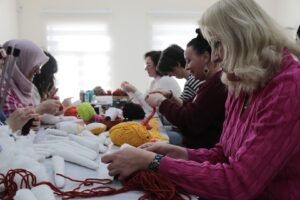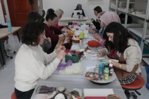 Nevşehir Belediyesi Kadın ve Aile Hizmetleri Müdürlüğü eğitmenleri ve kursiyerleri, depremzede çocuklar için bez bebek yapıyorlar.