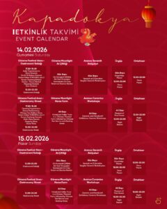 Merhaba; Kapadokya Alan Başkanlığımız ev sahipliğinde düzenlenecek 2026 Çin At Yılı Kapadokya Etkinlikleri Açılış Töreni, 14 Şubat 2026 tarihinde saat 17.30’da Göreme Etkinlik Alanında gerçekleştirilecektir. Katılımlarınızı bekler, iyi çalışmalar dileriz.