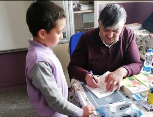 Söyleşi sonrası Yazar Aytekin değerler eğitimi kapsamında yazdığı Mutluluk Rüzgarı isimli öykü kitabını öğrencilere imzaladı.
