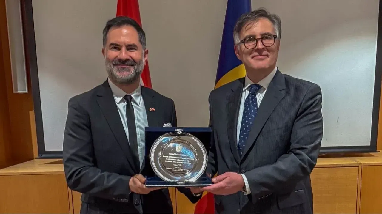 Büyükelçi Stefan Tinca tarafından takdim edilen plakette, Dinler’in iki ülke iş birliğine sağladığı katkılar şu ifadelerle yer aldı: