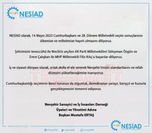 NESİAD olarak, 14 Mayıs 2023 Cumhurbaşkanı ve 28. Dönem Milletvekili seçim sonuçlarının