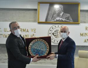 Belediye Başkanı Savran, ziyaret sonunda Bakan Karaismailoğlu’na çini bir tabak hediye etti.