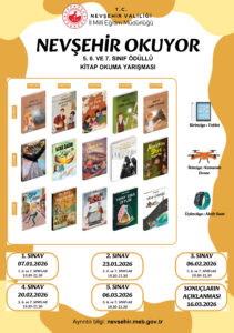İl Millî Eğitim Müdürlüğü bünyesinde bulunan resmi-özel tüm okullarda öğrenim gören 2, 3, 4, 5, 6 ve 7. sınıf öğrenciler için projede belirlenen takvim çerçevesinde; “Nevşehir Okuyor” projesi kapsamında “Kitap Okuma Yarışması” düzenlenecektir. Her sınıf kademesi için 5 kitap belirlenmiş olup ilgili tarihlerde sınavlar online yapılacaktır. Sınav sonucunda dereceye giren öğrenciler ödüllendirilecektir. Yarışma ile ilgili detaylı bilgilere kılavuzdan ulaşabilirsiniz.