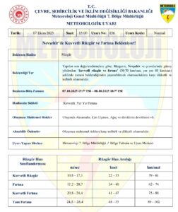 Meteoroloji Genel Müdürlüğü 7. Bölge Müdürlüğü, Nevşehir ve çevreleri için kuvvetli rüzgâr ve yer yer fırtına uyarısında bulundu.