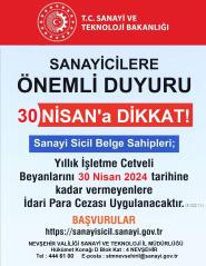 Sanayi Sicil Belgesi alan işletmeler aynı Kanunun 5’inci Maddesine göre her yıl vermek zorunda oldukları bir yıllık faaliyetlerini gösteren yıllık işletme cetvellerini takvim yılı sonundan itibaren en geç dört ay içinde (30 Nisan tarihine kadar) bağlı bulundukları İl Sanayi ve Teknoloji Müdürlüklerine bildirmek zorundadırlar.