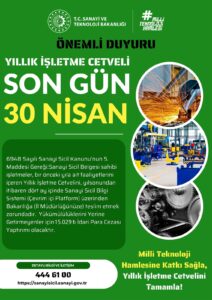 Bu çerçevede sanayi siciline kayıt olan işletmelerin 2025 yılına ait Yıllık İşletme Cetvellerini Sanayi ve Teknoloji Bakanlığınca yayımlanan SGM 2014/11 no’lu Tebliğin 11’nci maddesi uyarınca e- Devlet kapısı veya Bakanlık web sayfası Sanayi Sicil Bilgi Sistemi üzerinden (http://sanayisicil.sanayi.gov.tr) elektronik ortamda vermeleri gerekmektedir. Yoğunluk yaşanmaması adına son günlere bırakılmaması önem arz etmektedir. Sistem 7 gün 24 saat açık olduğundan mesai saatleri dışında ve hafta sonları da girişler yapılabilir.