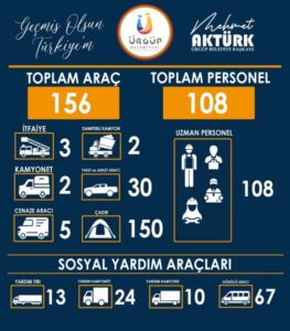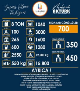 Kısa sürede organize olarak Ürgüp’e yakışır bir yardım organizasyonu sergiledikleri için başta Ürgüp Kaymakamı Cüneyt Caner’e, tüm paydaşlara, yardımsever vatandaşlara, gönüllülere ve belediye çalışanlarına teşekkür ettiğini ifade eden Ürgüp Belediye Başkanı Mehmet Aktürk, “Yardım kampanyamızı asrın felaketinin yaşandığı gecenin sabahında başlatmıştık, Sağolsunlar her zaman olduğu gibi vatandaşlarımız kampanyamıza yoğun ilgi gösterdi. Kısa sürede 114 adet çeşitli içerik ve ölçekli araçlarla doldurulmuş malzemeyi AFAD koordinesinde depremden etkilenen bölgelerimize gönderdik. 2. Günün gecesinde şahit olduğumuz bazı anlarda baktık ki depremzede vatandaşlarımızı bizim memleketimizde kıymetli turizmcilerimiz otellerinin kapısını açmış ve misafir edilmeye başlıyor onların da acil ihtiyaçları var. Yoğunluğumuzu ilçemizde ve bölgemizde misafir edilen vatandaşlarımıza verdik. Otellerde veya yakınlarının evinde kalan tüm vatandaşlarımızın ne ihtiyacı varsa temin etmeye çalıştık. 20 gün boyunca devam ettiğimiz kampanyamızda yardım talep masamız yaklaşık 10 bin gönüle dokundu. Sosyal tesisimizde ürettiğimiz 15.800 kap yemeğin süreç içerisinde ilçemizde misafir edilen ve yardım merkezimizde oluşturduğumuz dağıtım noktalarında dağıtımı yapılmaya devam ediyor. Emek veren her arkadaşıma ayrı ayrı teşekkür ediyorum.” Dedi.