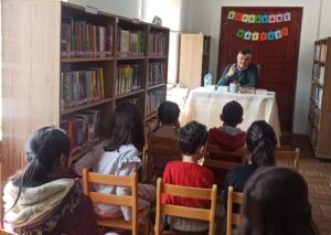 Kütüphane Okuma salonunda İlkokulu öğrencilerine hitap eden Yazar Osman Aytekin, kitap okuma porojeleri ve farklı kitap okuma alışkanlıklarindan örnekler verdi.